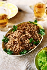 Refogar a cebola, o alho e o bacon. Sem desligar a panela, acrescentar o trigo espremido e aos poucos ir acrescentando a manteiga para manter o trigo úmido.
