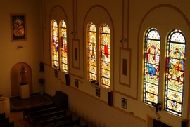 Os vitrais, de cores vivas e marcantes remetem à devoção e religiosidade lituana e brasileira. No lado direito, São Casimiro, com Nossa Senhora da Porta da Aurora, no lado esquerdo do vitral; Santa Ana e Nossa Senhora Menina. Santa Ana tem grande devoção na Lituânia. Em seguida, Nossa Senhora Aparecida, padroeira do Brasil e o Cristo Redentor, grande símbolo da religiosidade brasileira, mundialmente conhecido. Depois Santa Cecília, padroeira da música e ao seu lado, o vitral de São Miguel Arcanjo. Em seguida o encontro da cruz por Santa Helena e por fim, um vitral de Nossa Senhora, infelizmente esmaecido, com uma capelinha rural da Lituânia, baseado em pintura da artista lituana Vlada Stancikaite Abraitiene que morou em Vila Zelina. No lado esquerdo estão os vitrais da Anunciação, do Nascimento de Jesus, da Fuga para o Egito, da Sagrada Família em Nazaré, do Batismo de Jesus e de Jesus entregando as chaves da Igreja para São Pedro, de Sta. Margarida de Alacoque e infelizmente, também esmaecido, o vitral do papa João XXIII, recentemente canonizado.